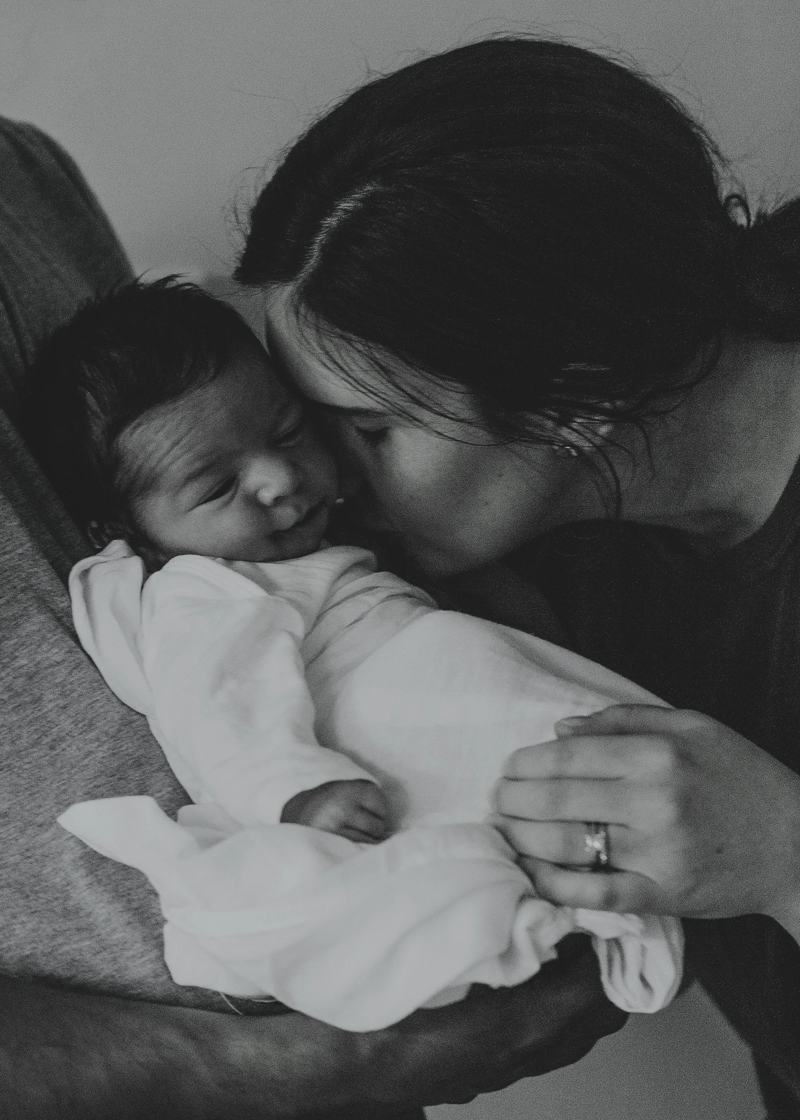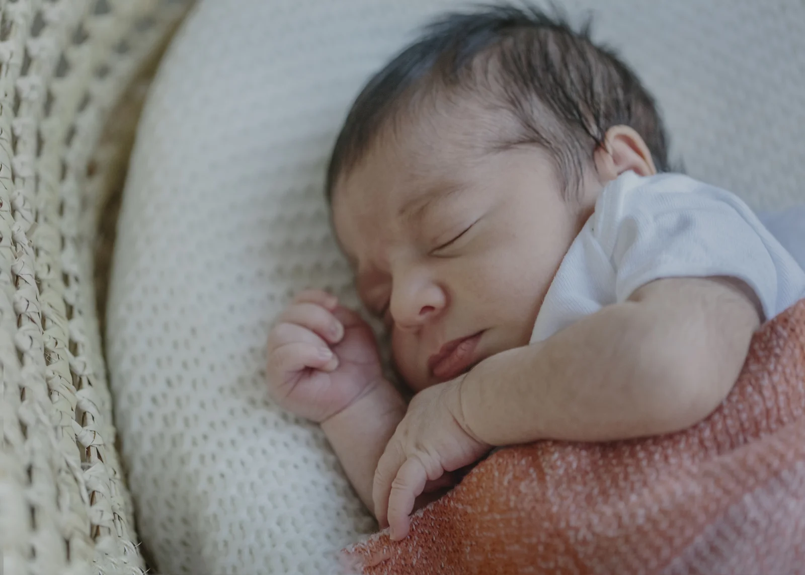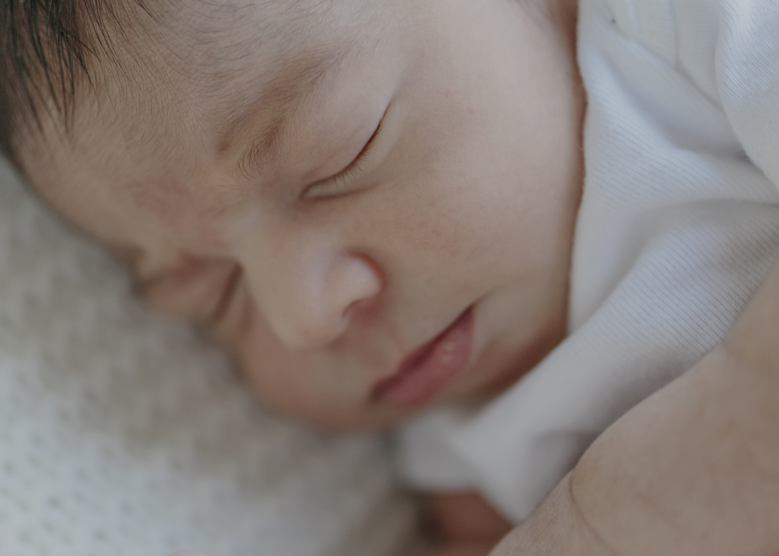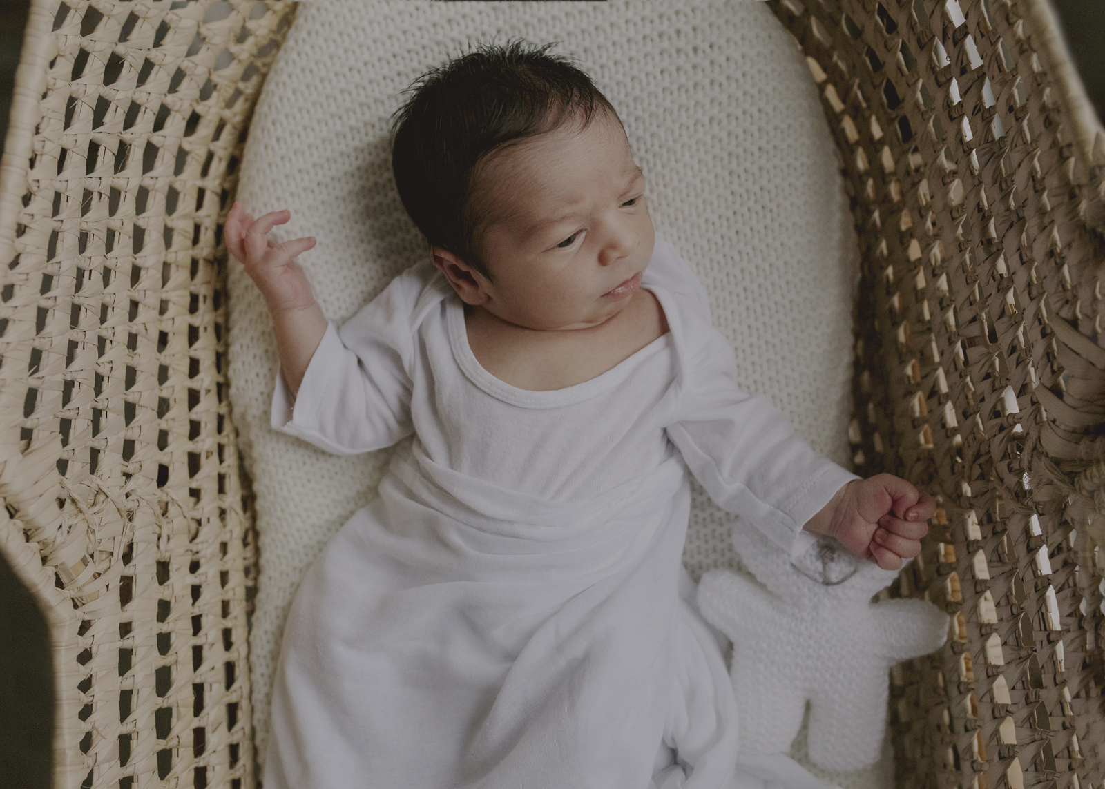 Baby all in white or swaddled in a textured blanket with just the face showing